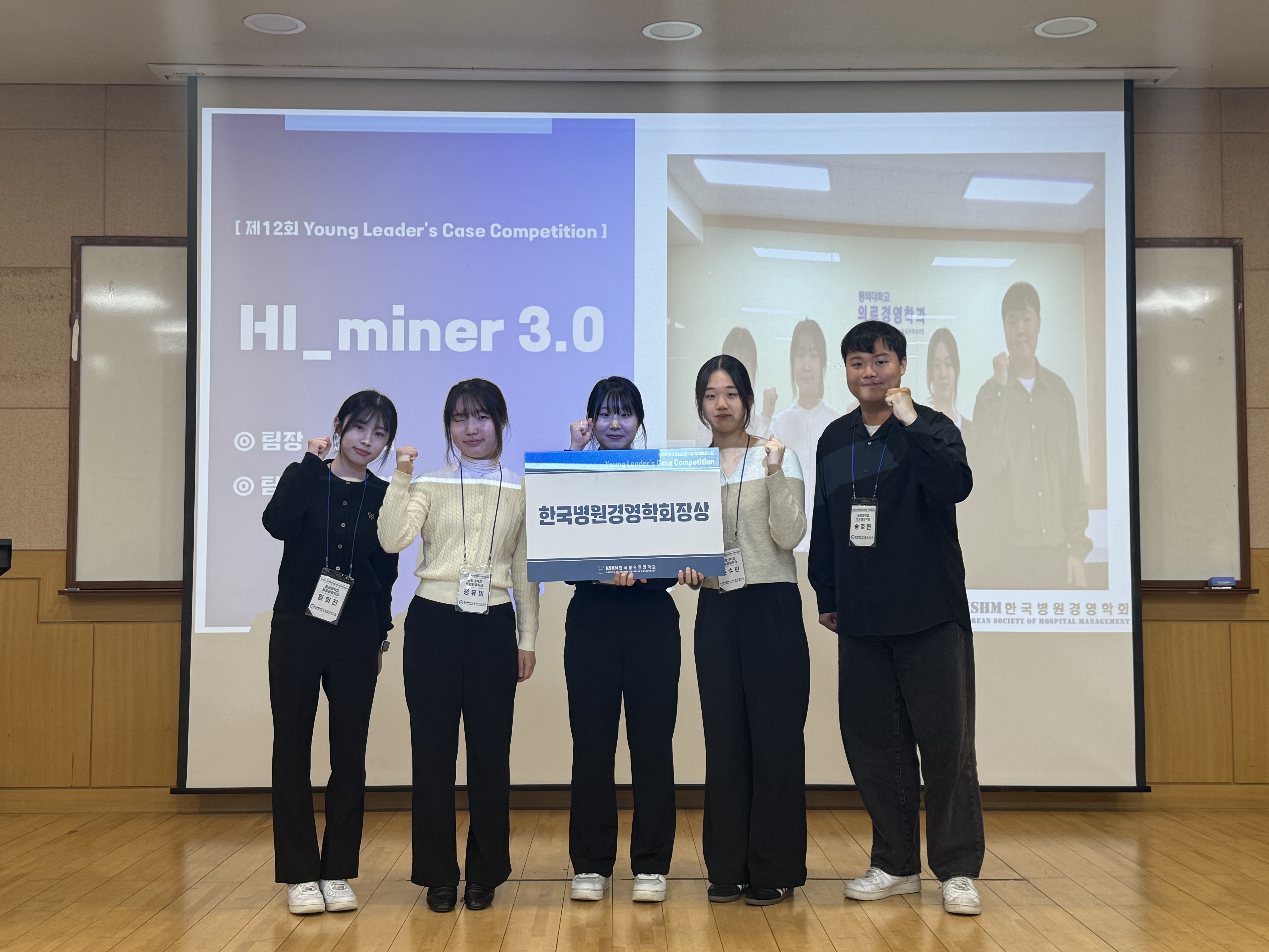 동의대학교 의료경영학과 학부생 5명으로 구성된 ‘HI-Miner 3.0’ 팀이 지난 10월 24일 연세대학교 보건대학원에서 열린 2025년 한국병원경영학회 추계 학술대회 – 제12회 Young Leader’s Case Competition에서 대회 최고상인 ‘한국병원경영학회장상’을 수상했다.