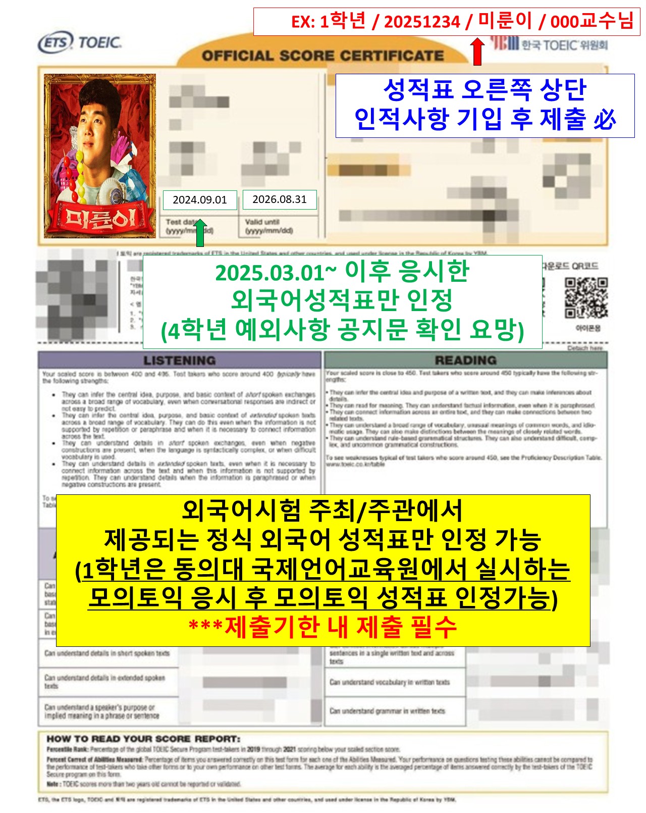 - 이전에 응시한 외국어 성적이 없는 학생은 외국어 시험 의무 응시 후 성적표 제출 필수