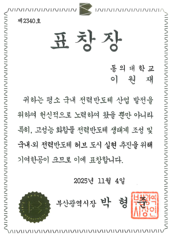 동의대 신소재 이원재 교수, 전력반도체 산업발전 공헌 부산시장 표창장 수상