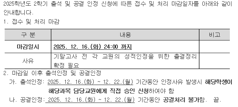 [2025학년도 2학기 출석 및 공결 인정 신청 접수 및 처리 마감일자 안내]